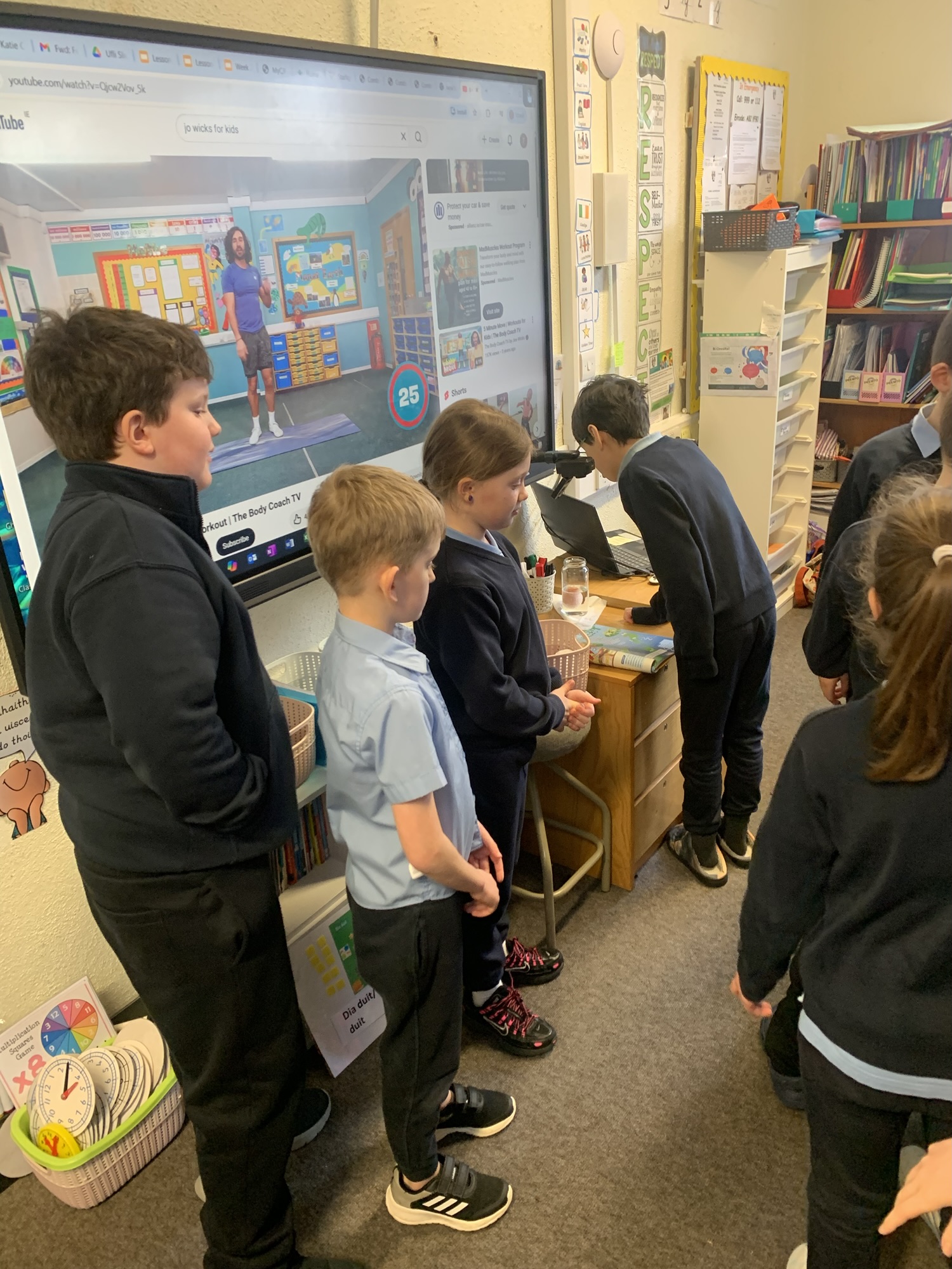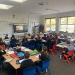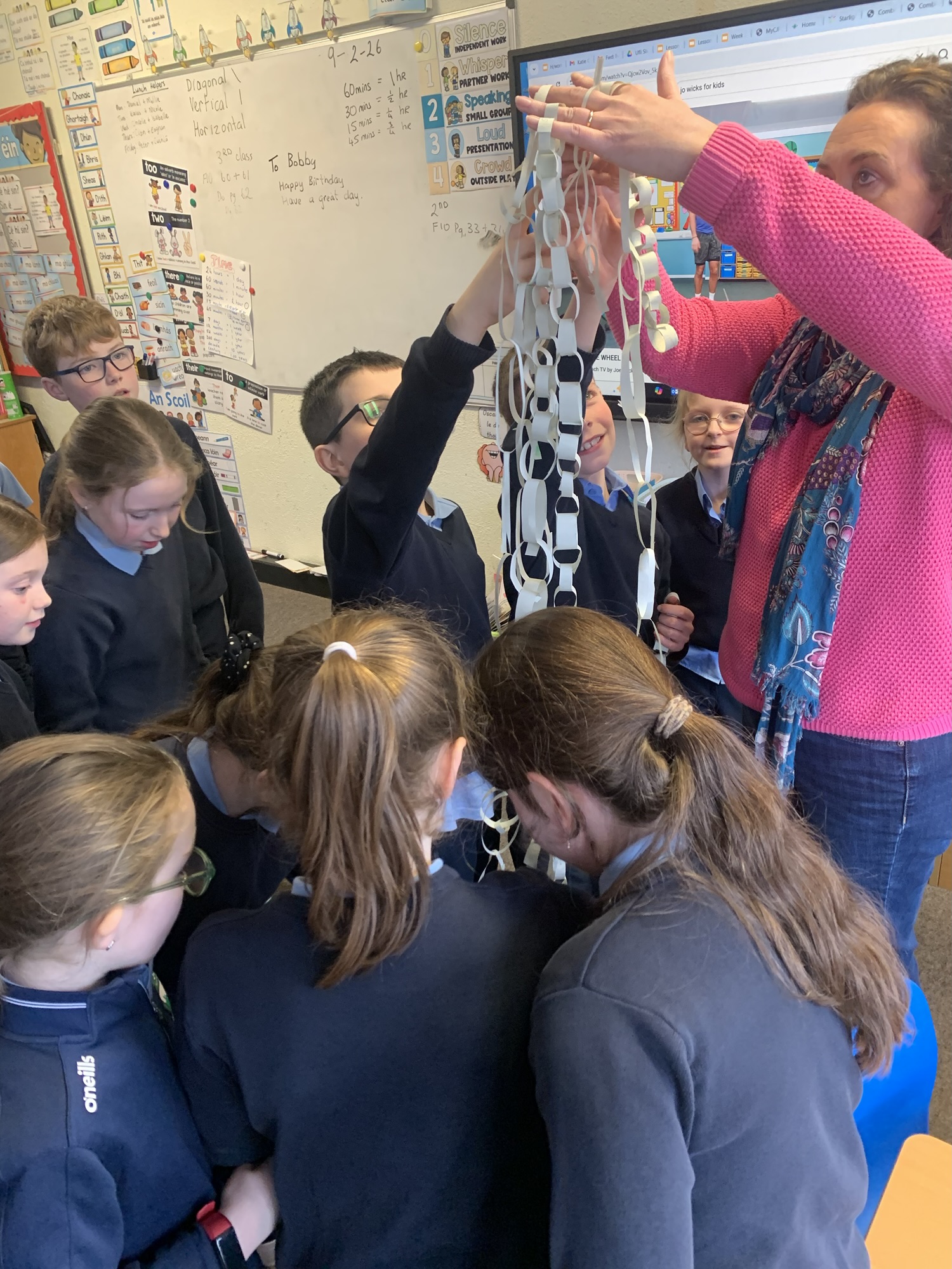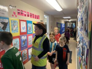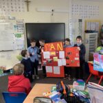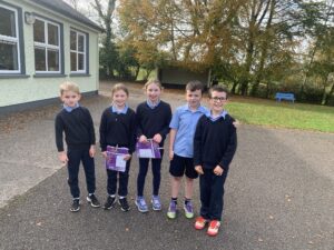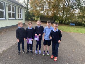 17.10.26- Maths Week: As part of Maths Week, 2nd and 3rd class participated in the Active School Walkway Activity in small groups and pairs. The objective was to find two numbers on each sign and add them together. This created an opportunity to add tens and units with renaming.