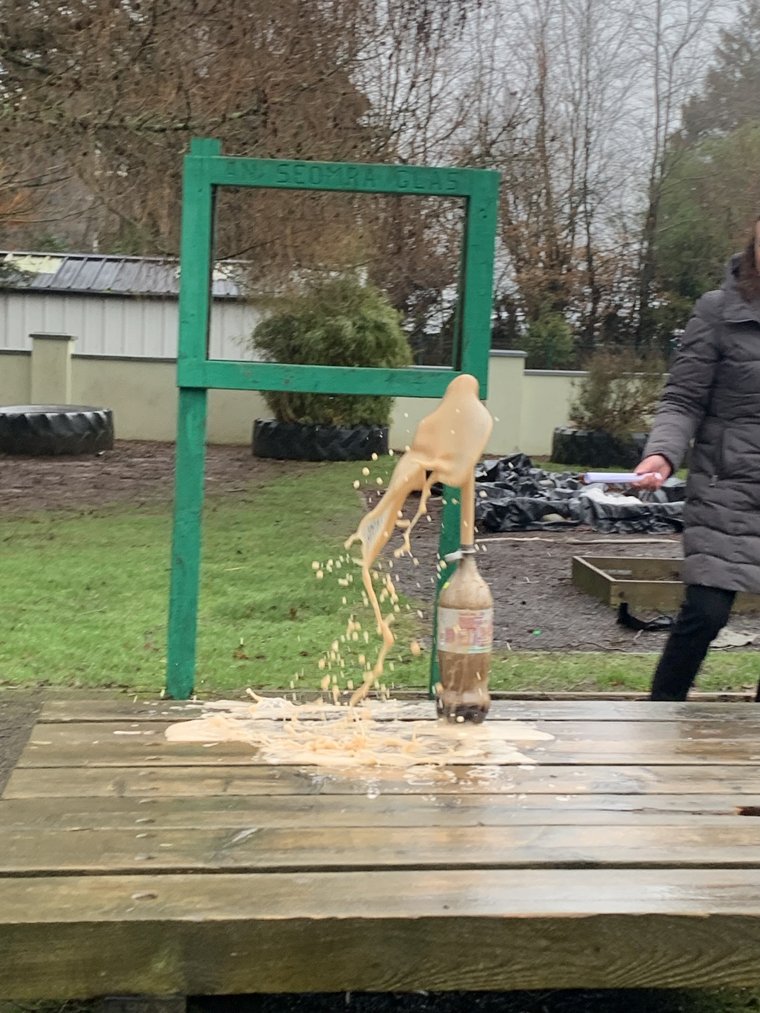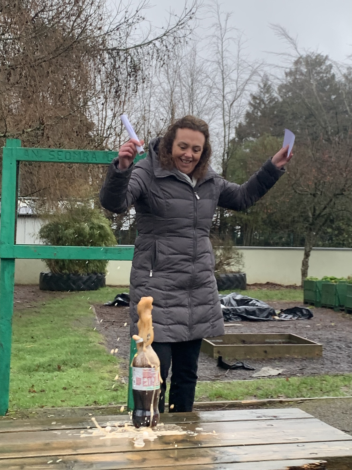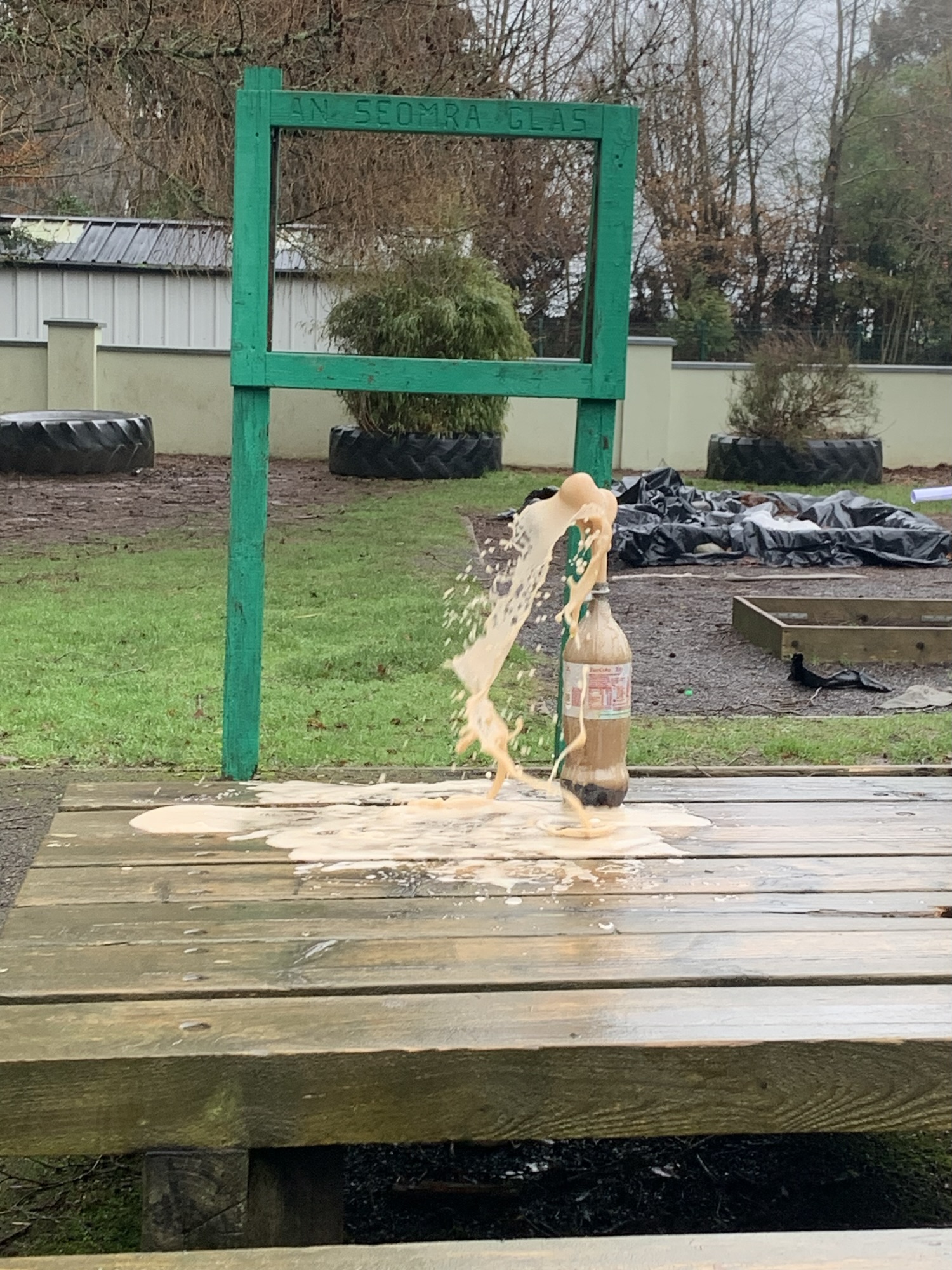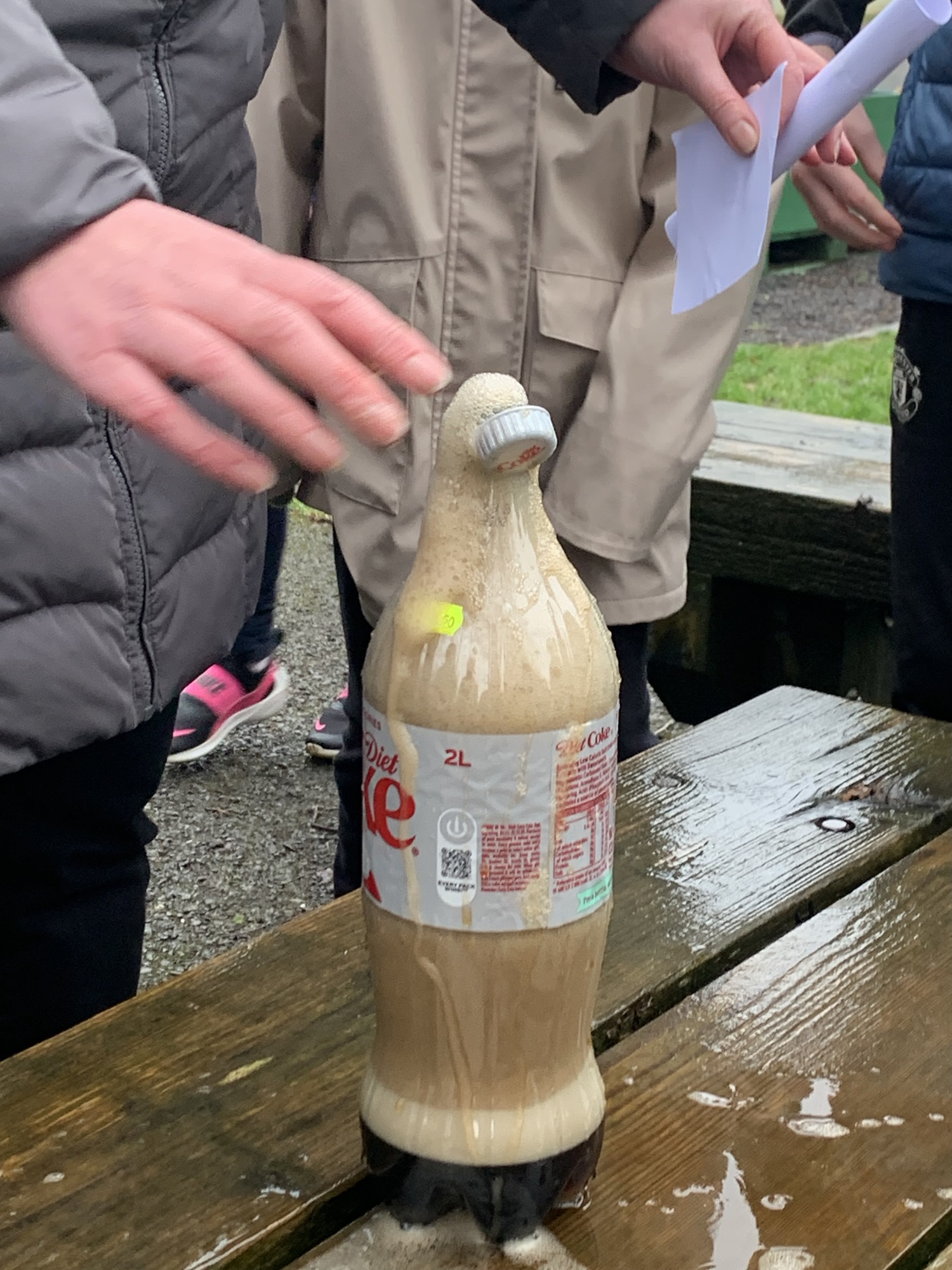 Outside on the final day of science week, we explored what happens when we place Mentos into a bottle of Diet Coke. We saw a physical reaction that caused a large eruption of the coke.