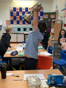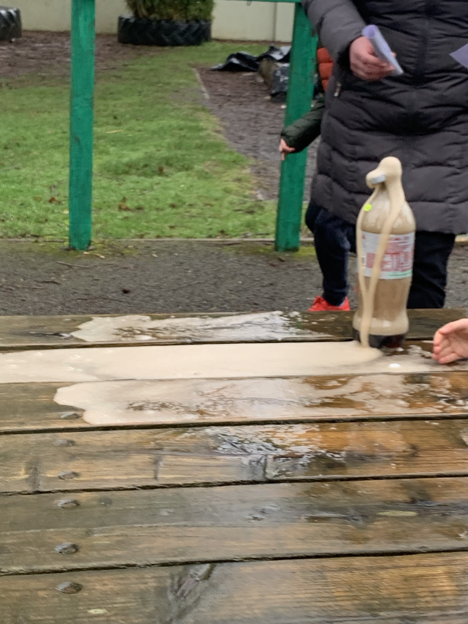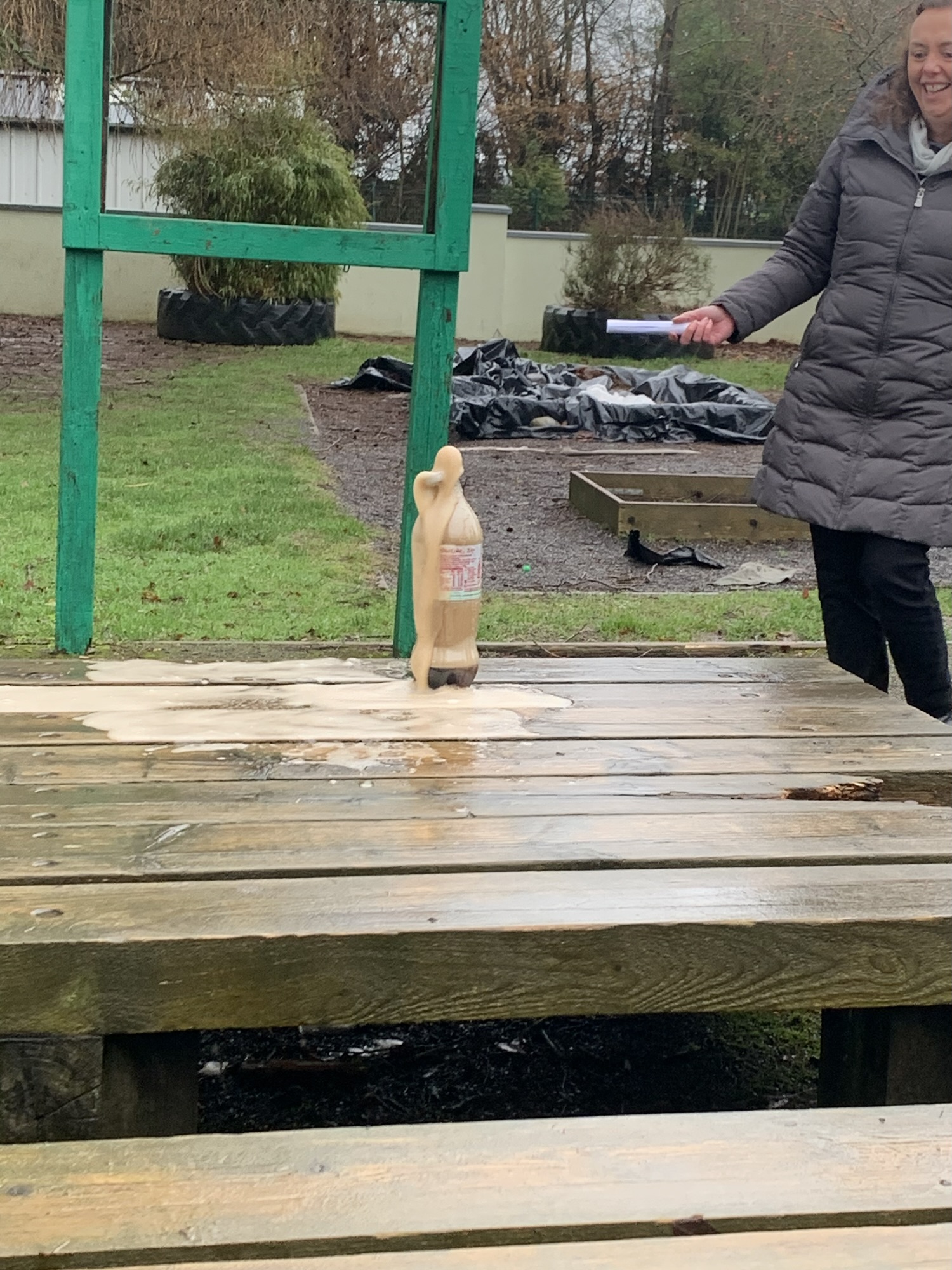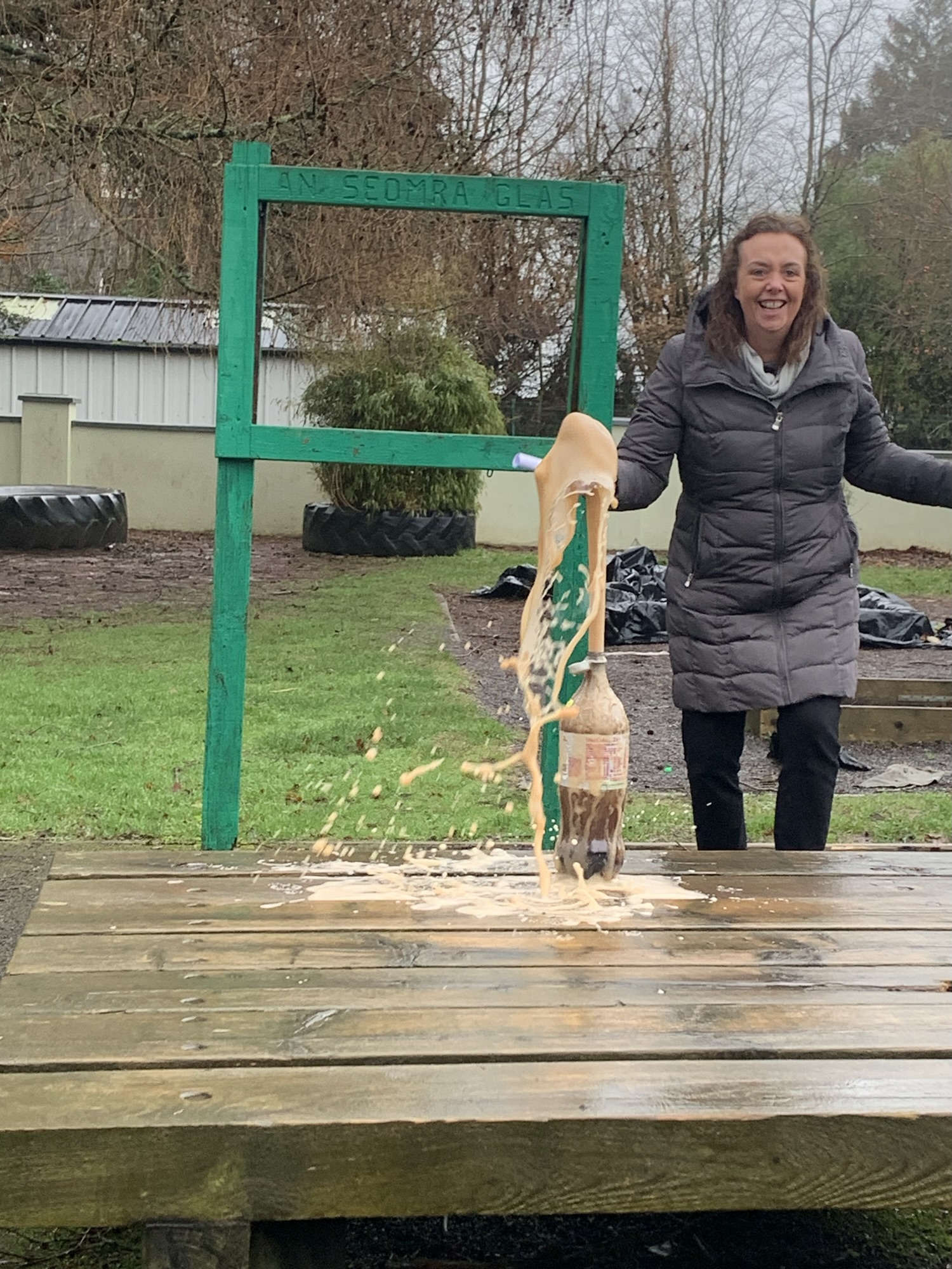 Outside on the final day of science week, we explored what happens when we place Mentos into a bottle of Diet Coke. We saw a physical reaction that caused a large eruption of the coke.