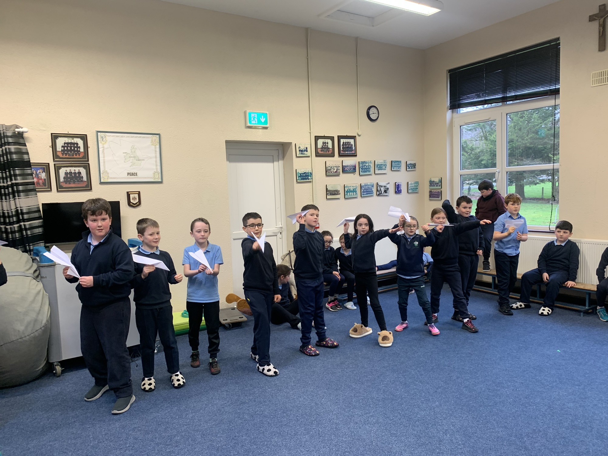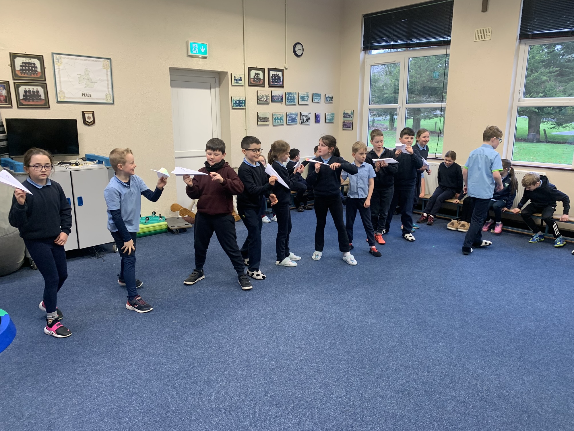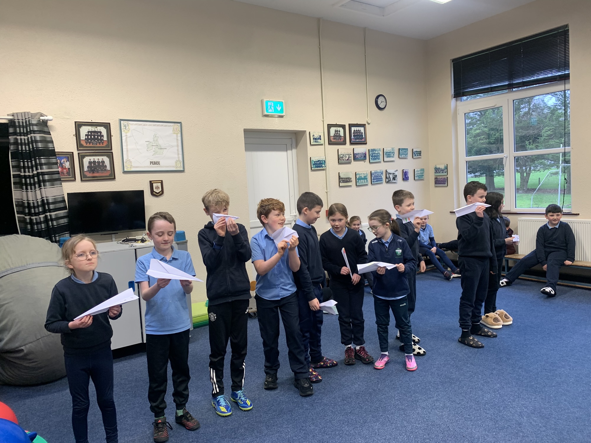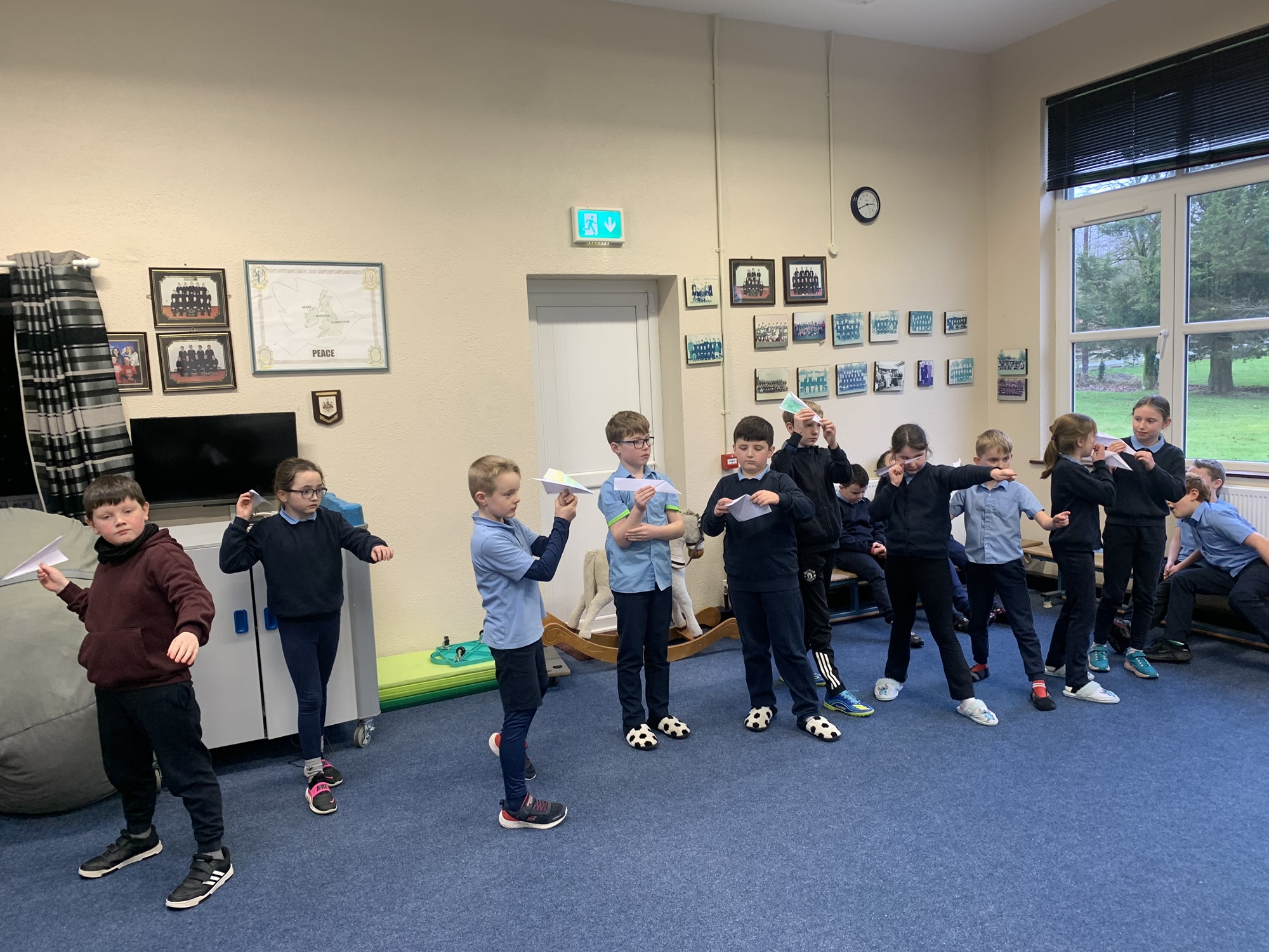 We studied the Wright Brothers and discovered that they flew the first powered, sustained, and controlled aeroplane in December 1903.  We made paper aeroplanes, and in our hall, we had a competition to see whose aeroplane would fly the furthest.