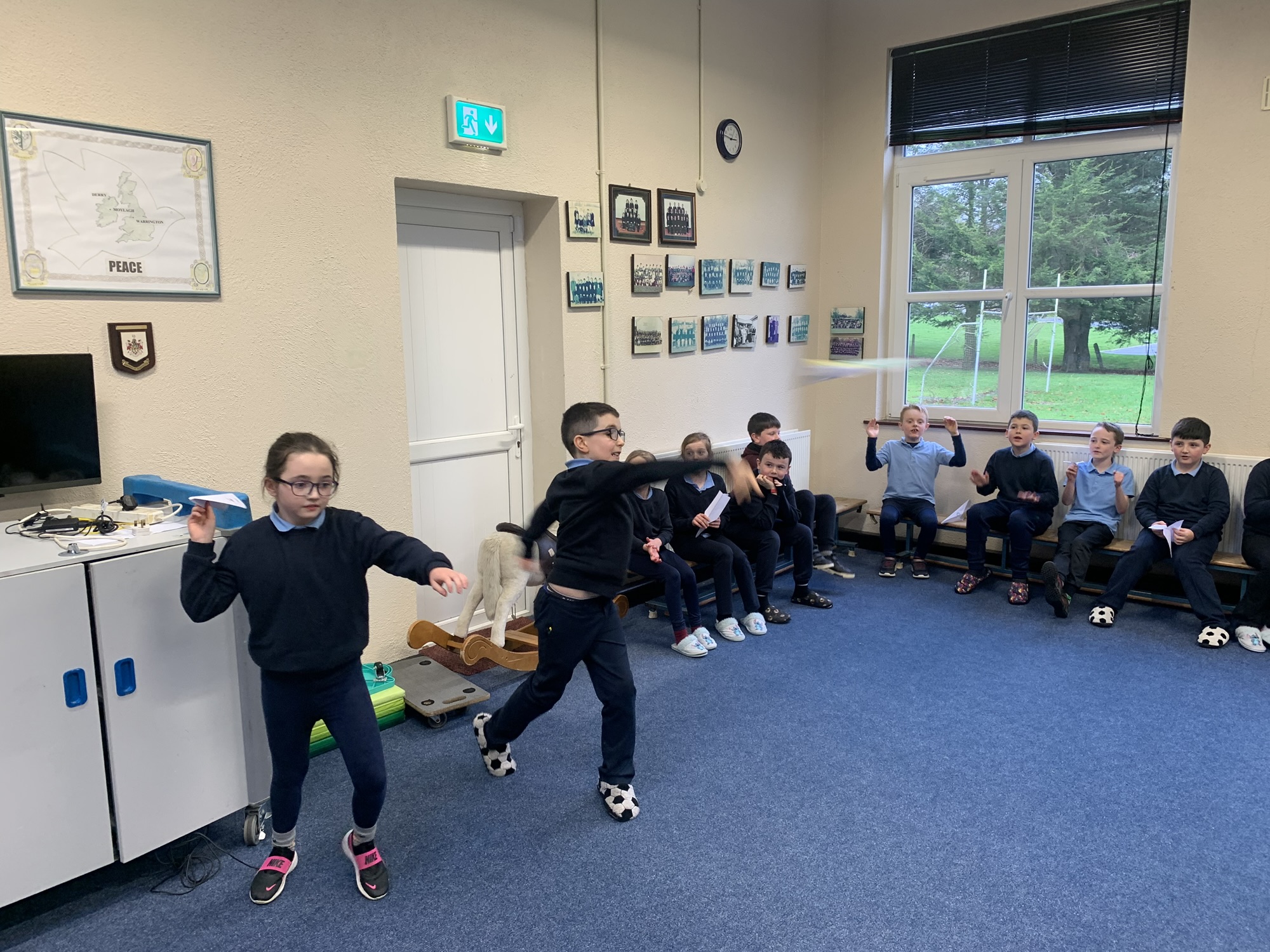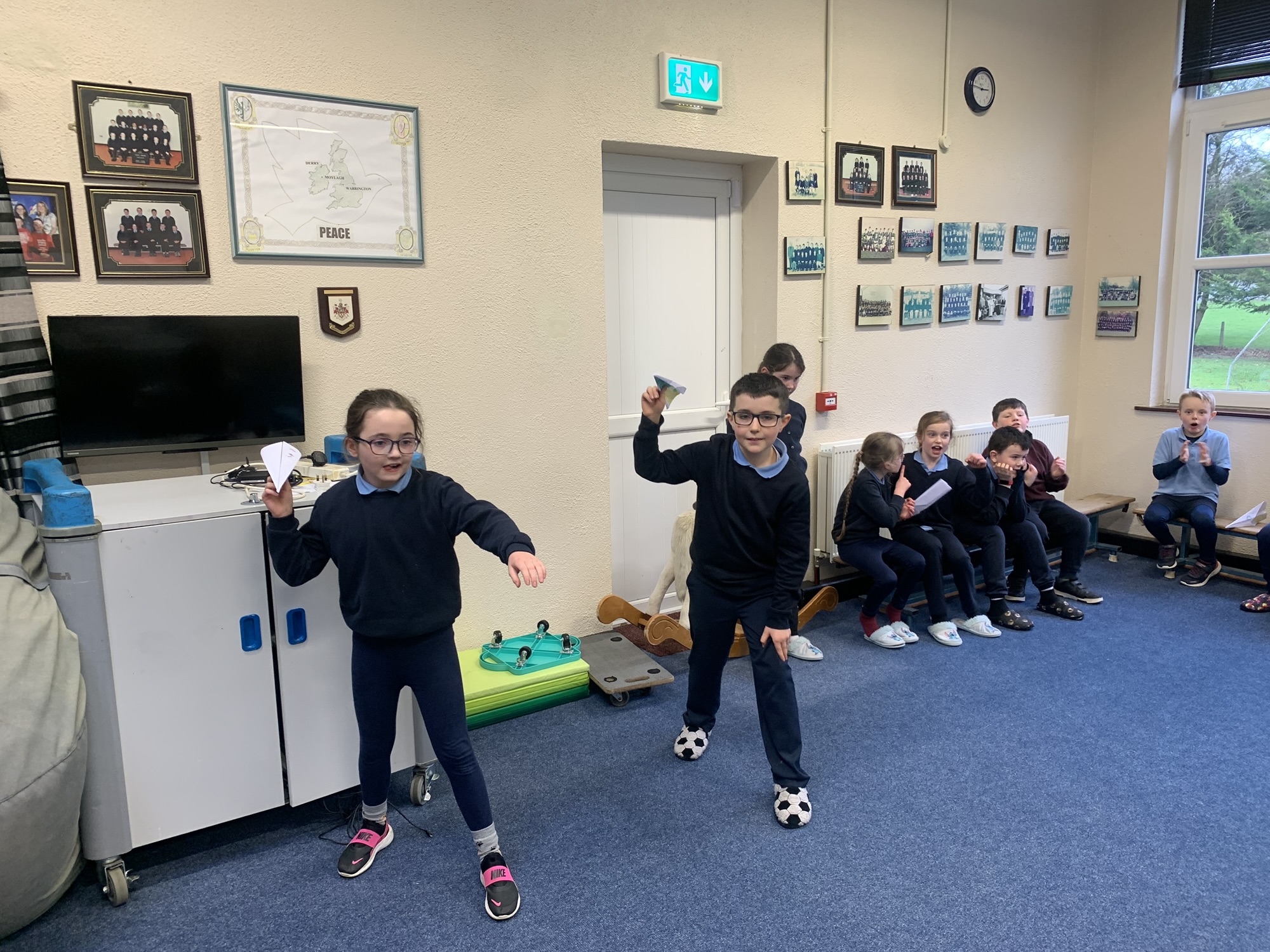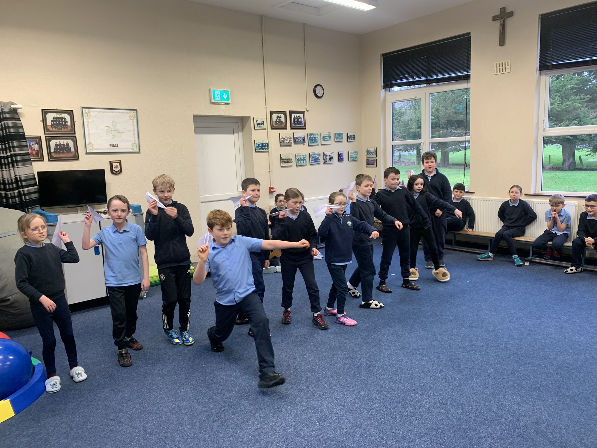 We studied the Wright Brothers and discovered that they flew the first powered, sustained, and controlled aeroplane in December 1903.  We made paper aeroplanes, and in our hall, we had a competition to see whose aeroplane would fly the furthest.