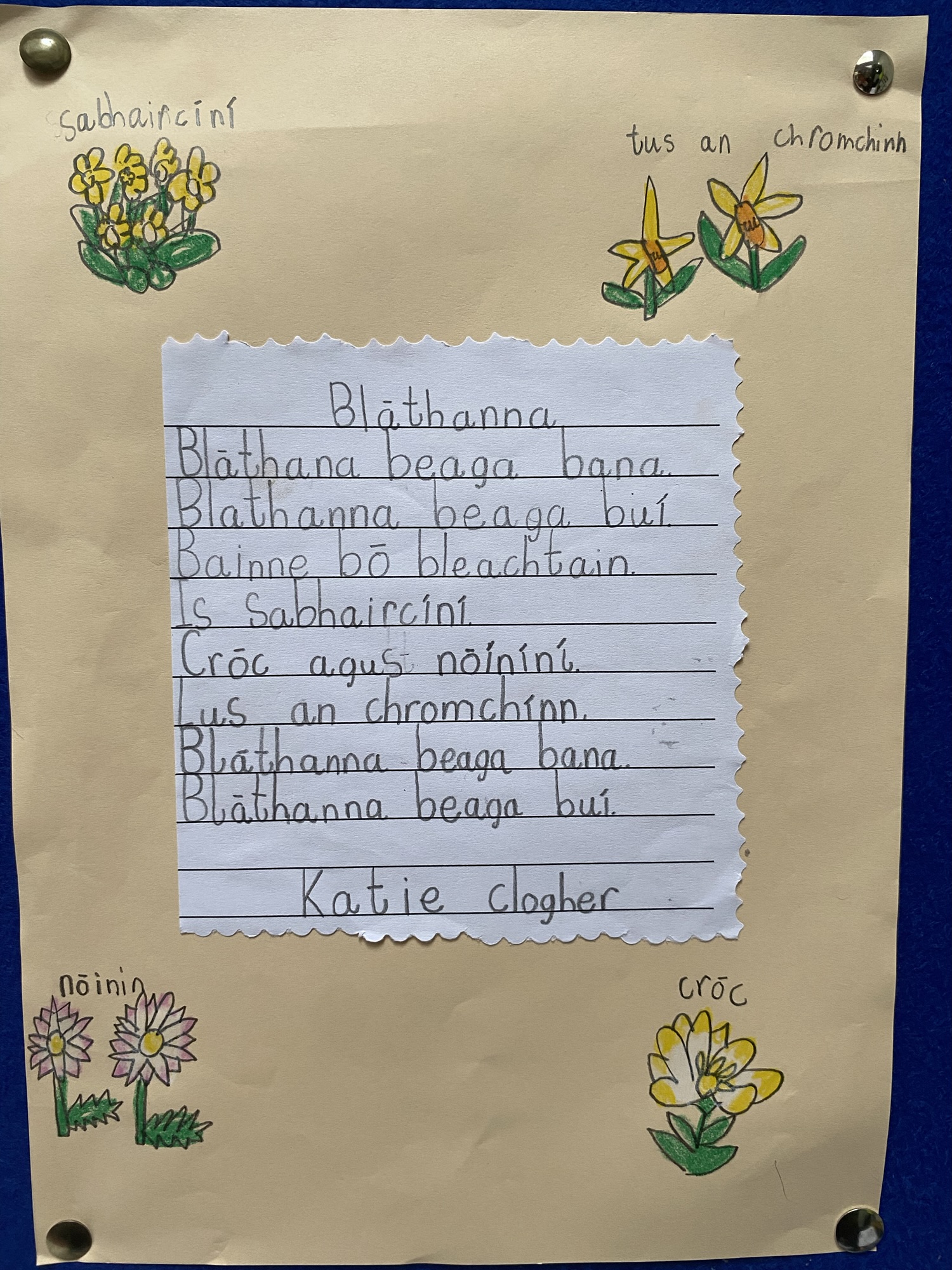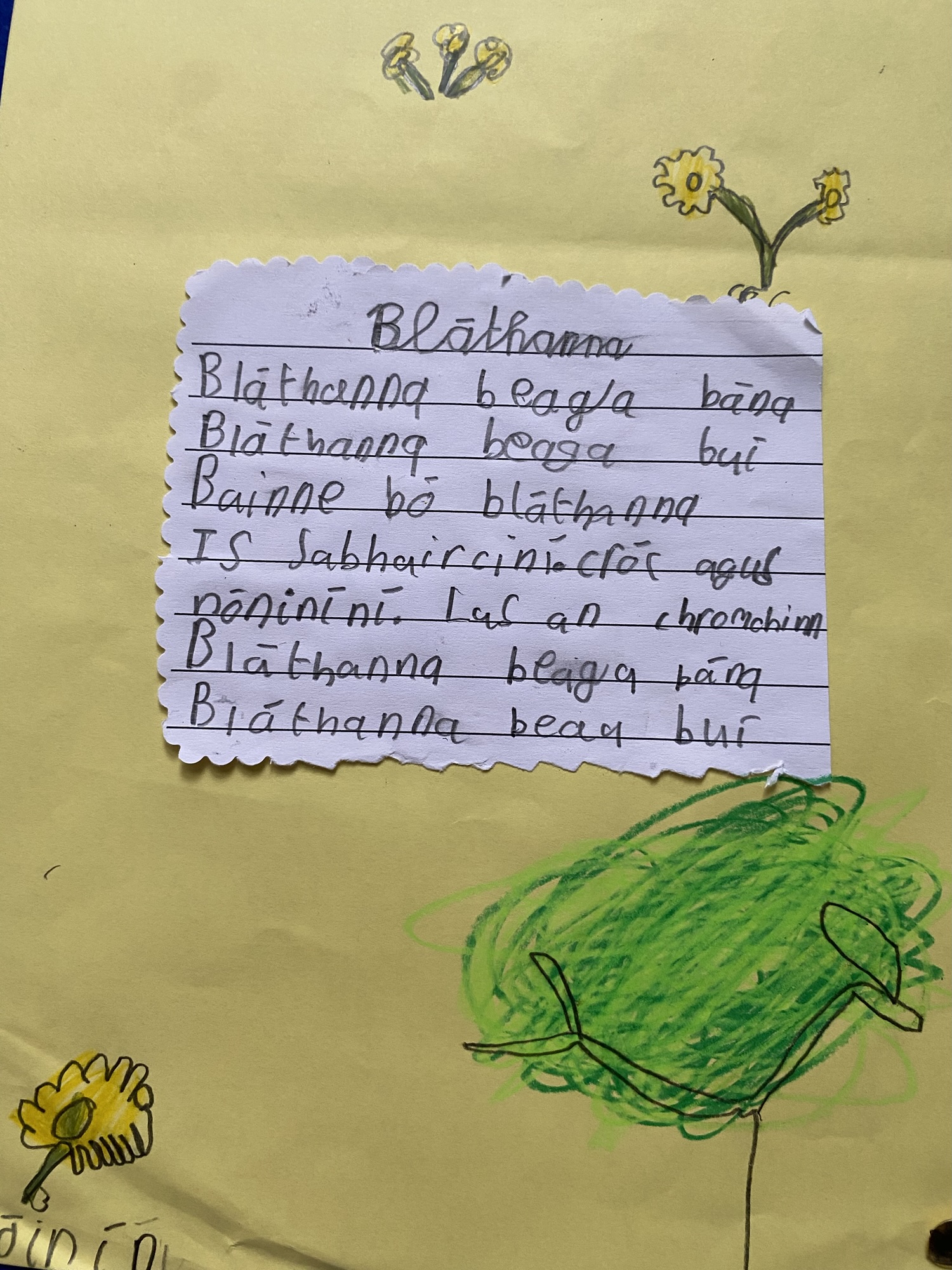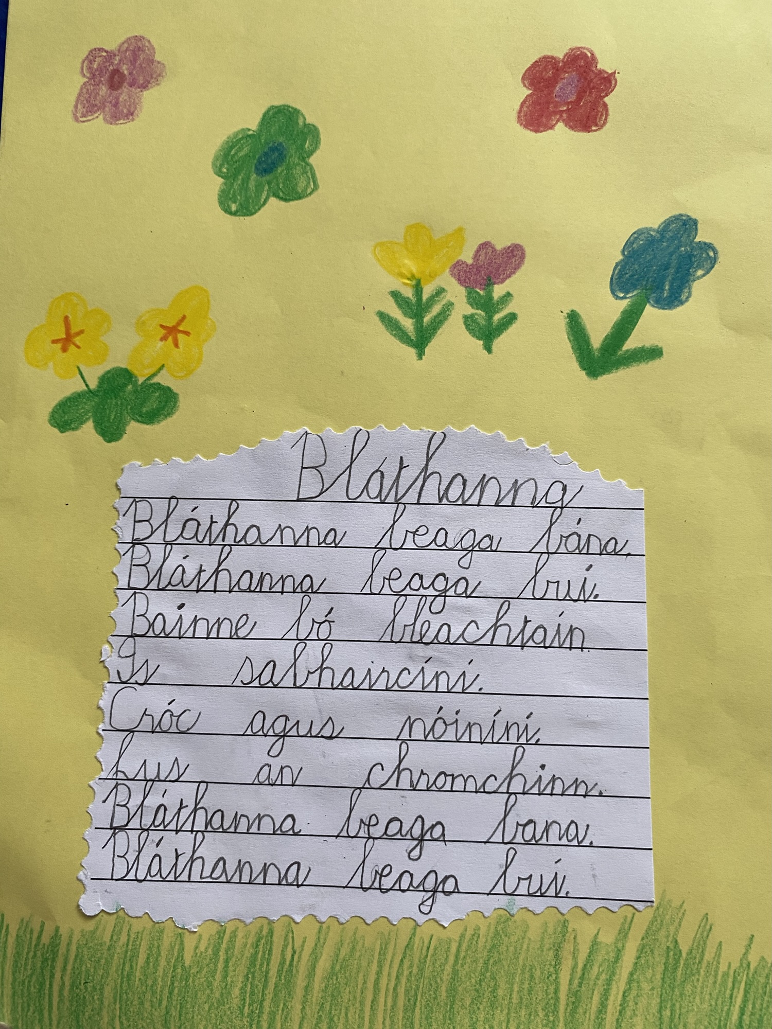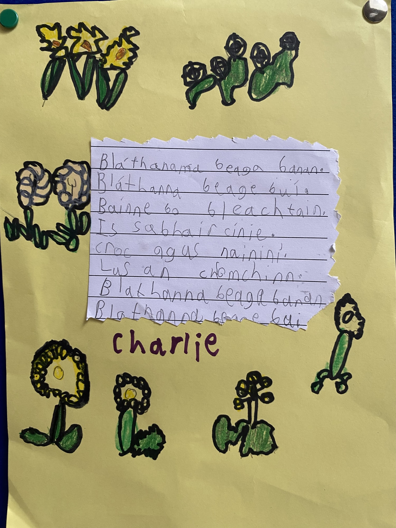 Daffodils and tulips are their favourites, so they created a colourful art display of these.